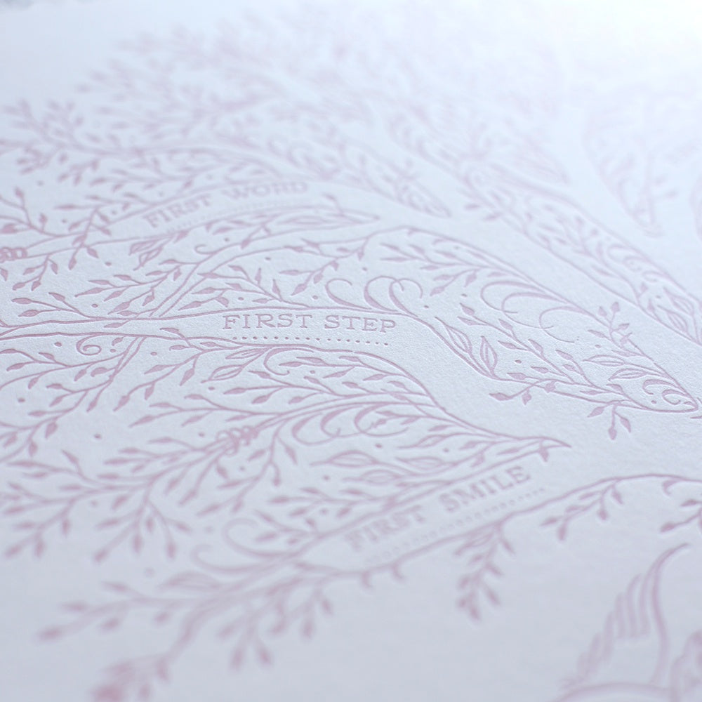 Ancesserie's Birth Tree print to document baby's first year milestones. Designed by Ancesserie and rendered by their calligrapher's hand, each piece is letterpress printed in Blush Pink,on 100% cotton, pearl white stock. Print measures 15_ x 15_.A wonderful gift for the new mother to record each precious moment among the branches of this everlasting tree. Birth details, including baby's name, birth date and weight may be recorded on the banner at base of trunk.