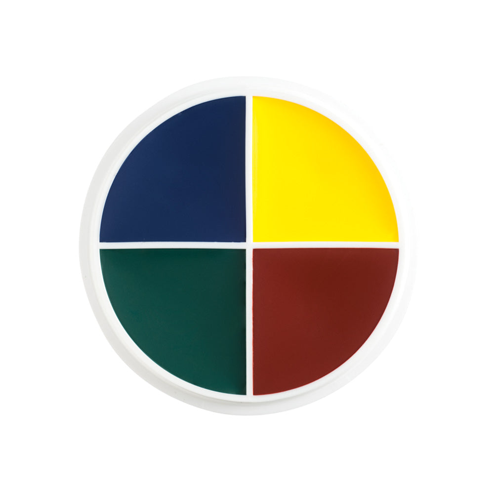 The Cuts and Bruises Wheel features four shades valuable for creating injuries. The colors are based off of the shades that appear in the skin throughout the lifespan of an injury. The shades Blood Red, and Sapphire Blue can be used to represent injured and distressed flesh, while Forest Green and Yellow work perfectly to mimic the colors that occur throughout the healing process of the skin.
