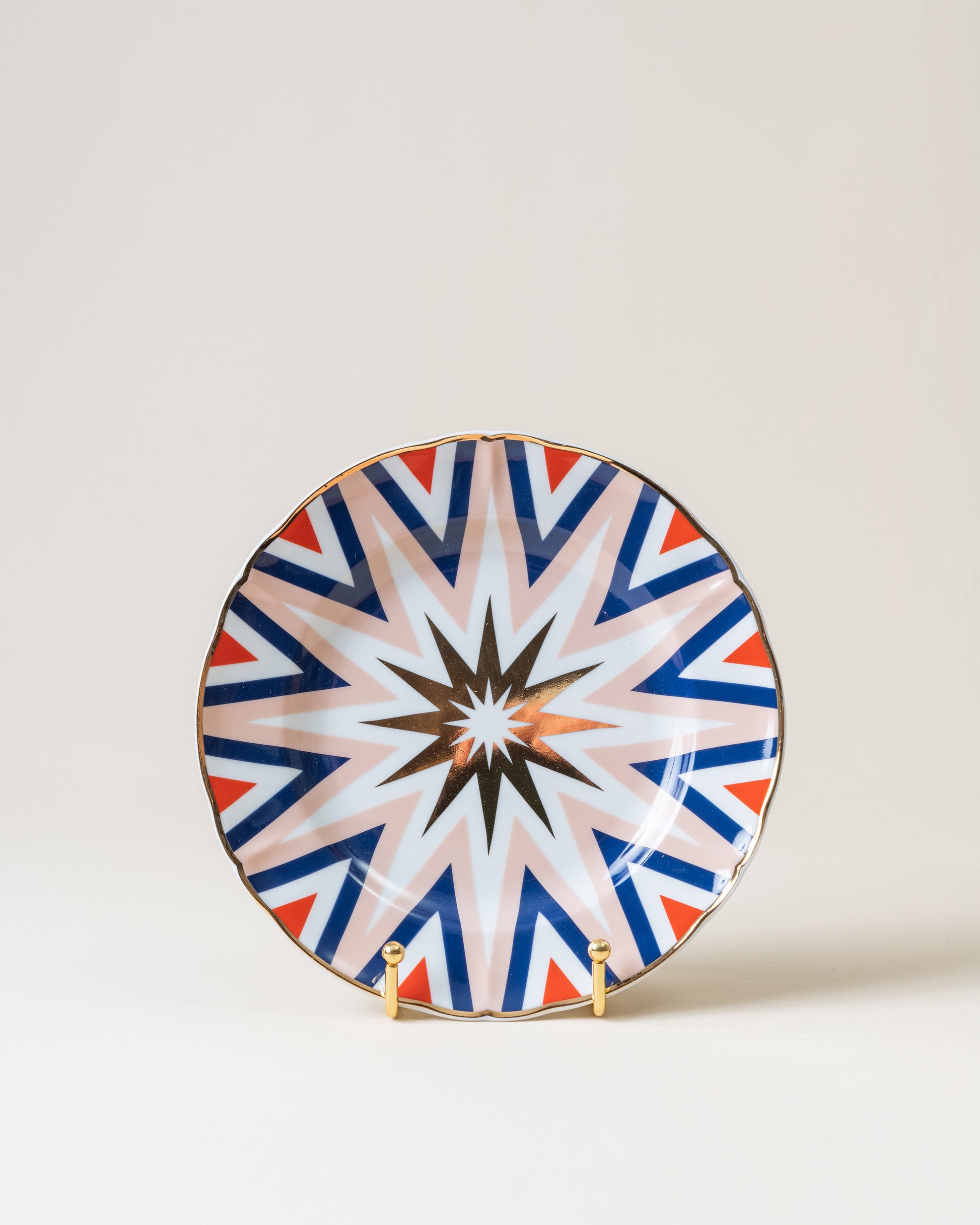 A fun and vibrant porcelain dessert plate from Bitossi with red and blue coloured transfers and gold details making a star at the centre. All it's missing is a slice of tart/cake/pie/ [delete as appropriate]