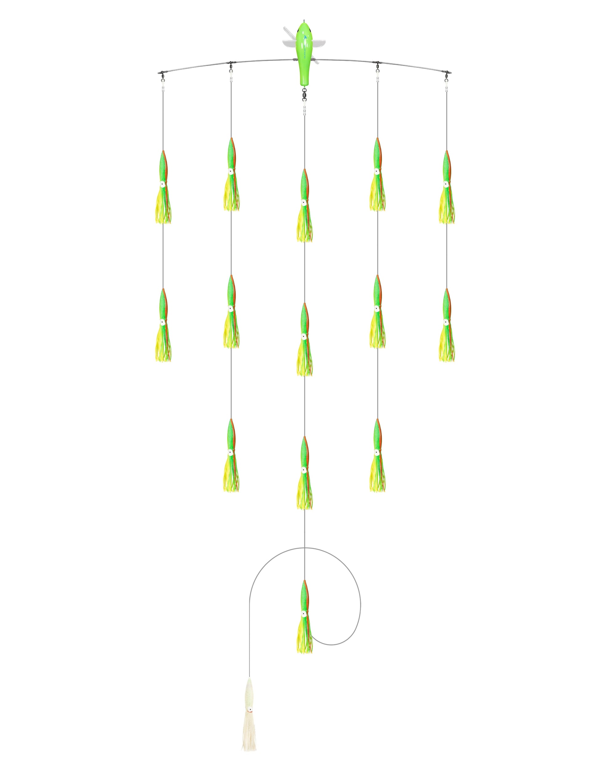 BLUEWING 36in Fishing Spreader Bar Port Walker Baits Bulb Squids and Trolling Birds Spreader Bar for Offshore Trolling, Yellow/Green