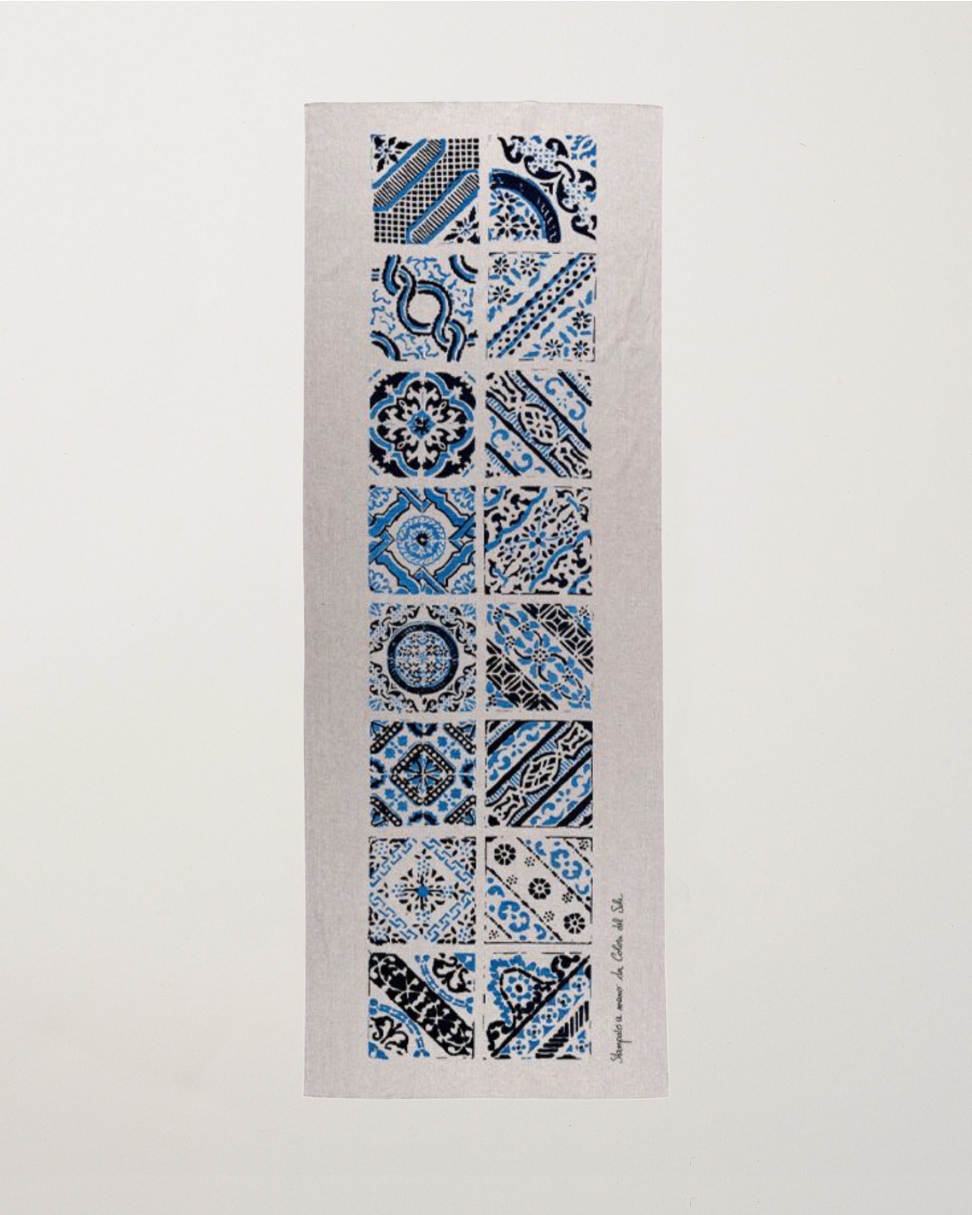 This Maiolica runner by Colori Del Sole is made by hand according to traditional screen printing techniques. The rustic linen is brought to life by the colored lines of the majolica [meaning 'earthenware'] in soft shades of blue.