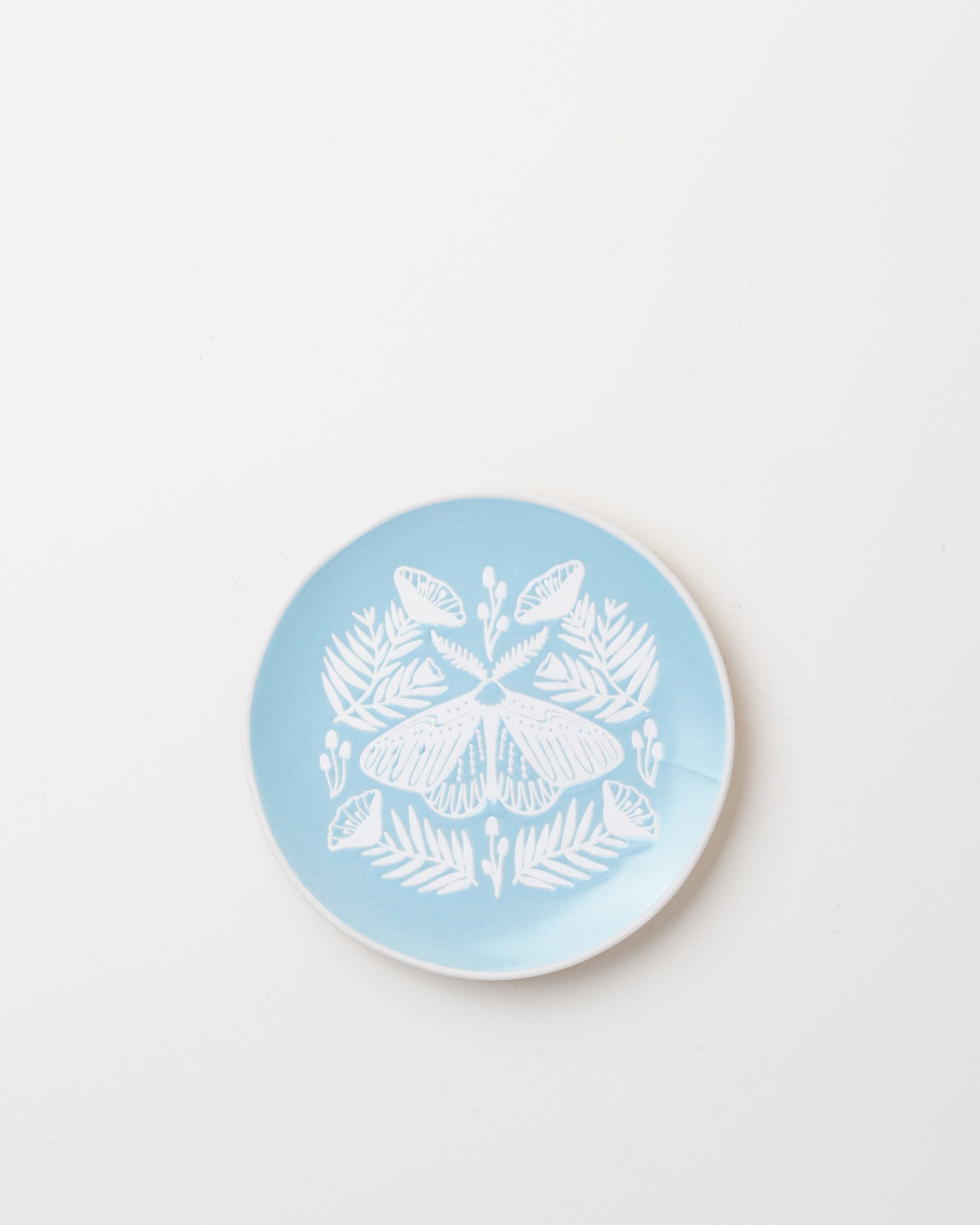 For your trinkets - this soft blue round tray by Fringe Studio designed by Juliana Tipton. Made from matte seafoam glaze, wax resist design, and exposed stoneware base, use it to keep your littlest possessions safe, jewellery neat and tidy, or candles burning safely.