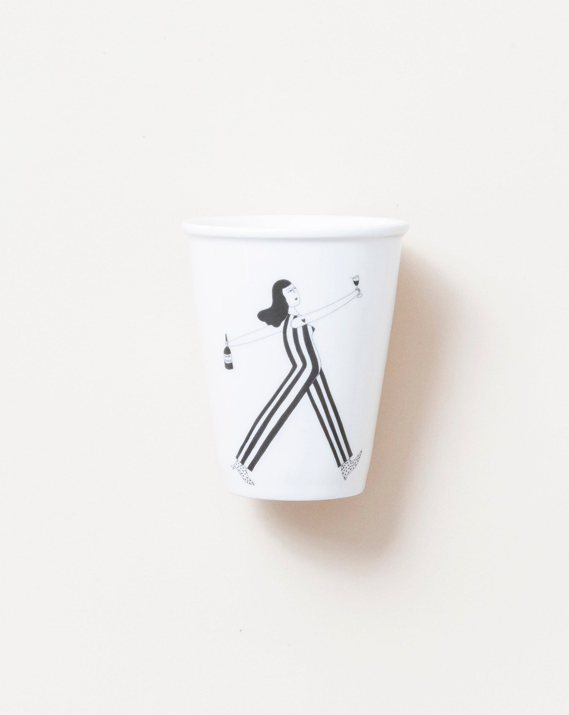 A fun little porcelain cup by Helen B. It's off-white background features one of Helen's classic illustrations of a walking lady with a glass of wine in one hand and the bottle in the other wearing a fabulous stripy jumpsuit. A fantastic gift for all those you love to share a glass of wine or two with, or just to add to your own kitchen.