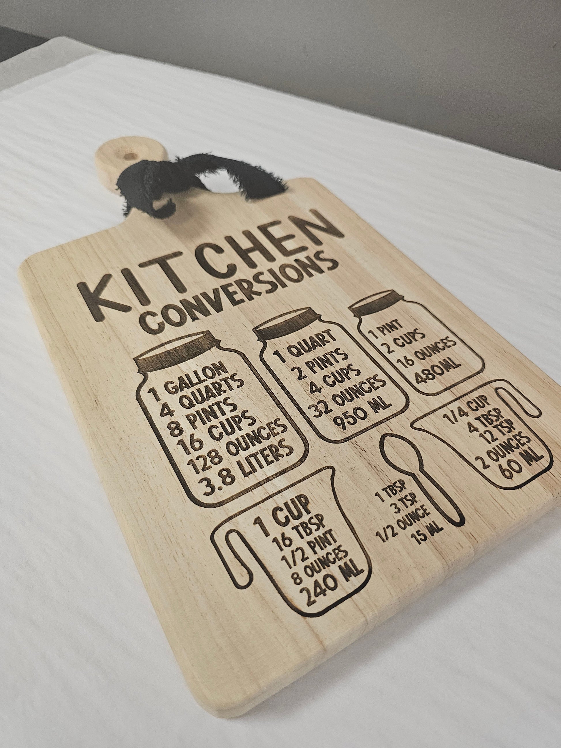 The kitchen conversion cutting board is a versatile and practical addition to any kitchen. This wood bread board not only serves as a sturdy surface for cutting and chopping ingredients, but it also features a handy conversion chart engraved right into the surface.