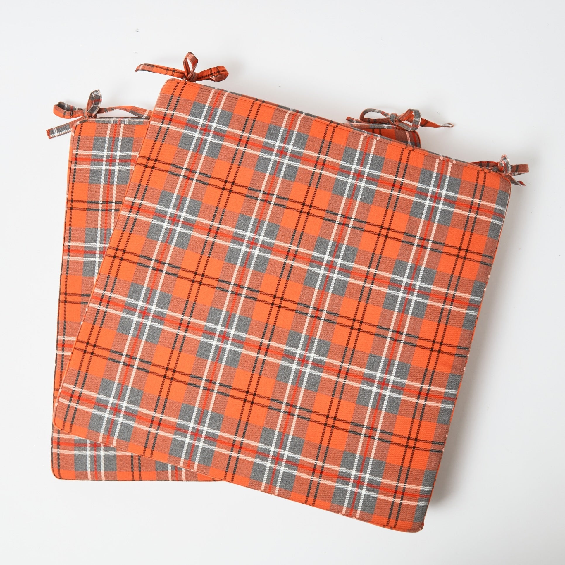 Featuring an orange tartan with gray, red and white, this bright cushion can be used for Halloween, Thanksgiving, and beyond.