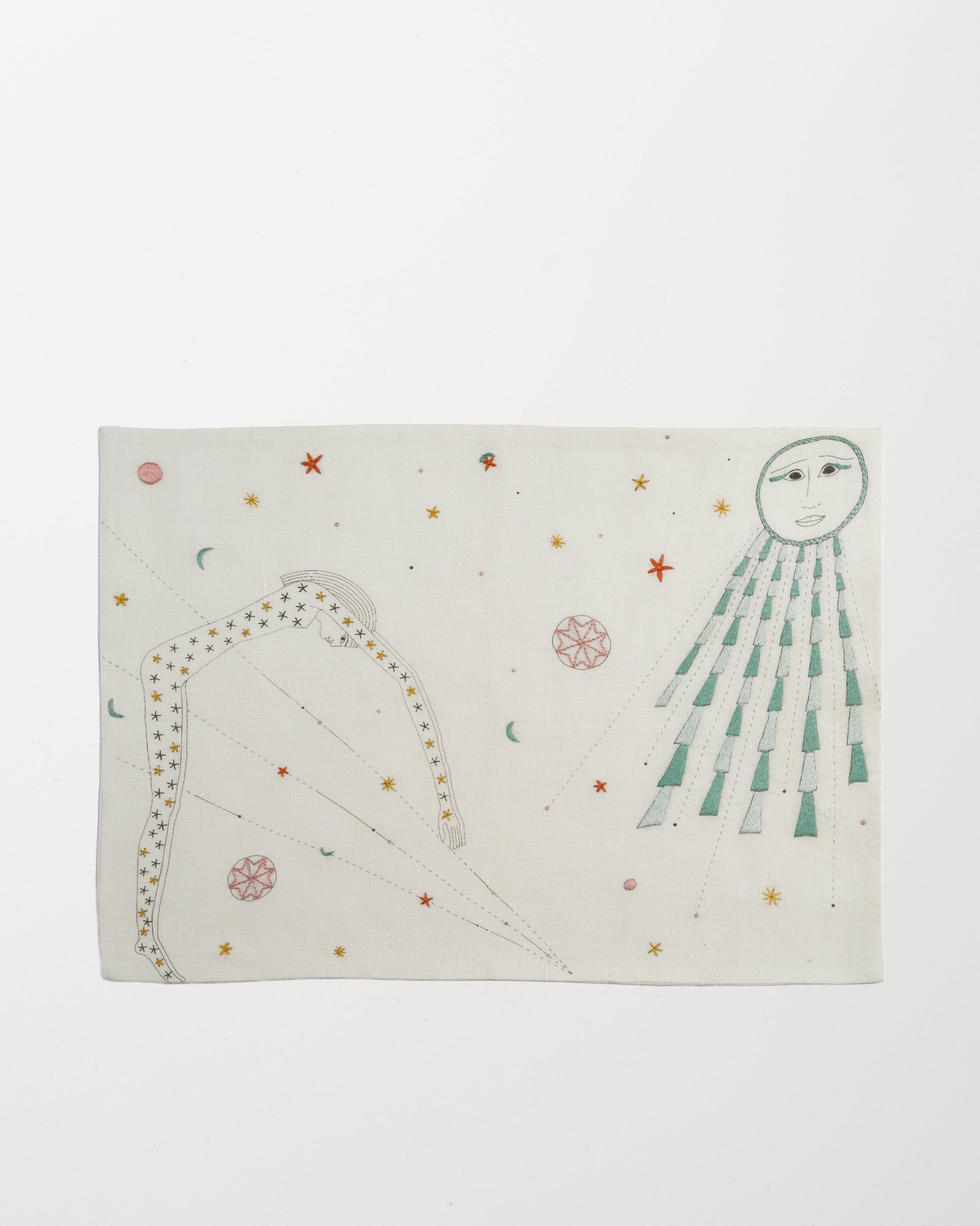 A surrealist dream takes shape across this aqua white linen placemat by Malaika which has been hand-crafted in Cairo by their skilled artisans at the Malaika Embroidery Training Centre (TOH). Planets, stars and the Goddess Nut, goddess of the sky and protector of the world, come together in an eclectic, fantastical mix, to make any alfresco feast feel joyful and spirited.