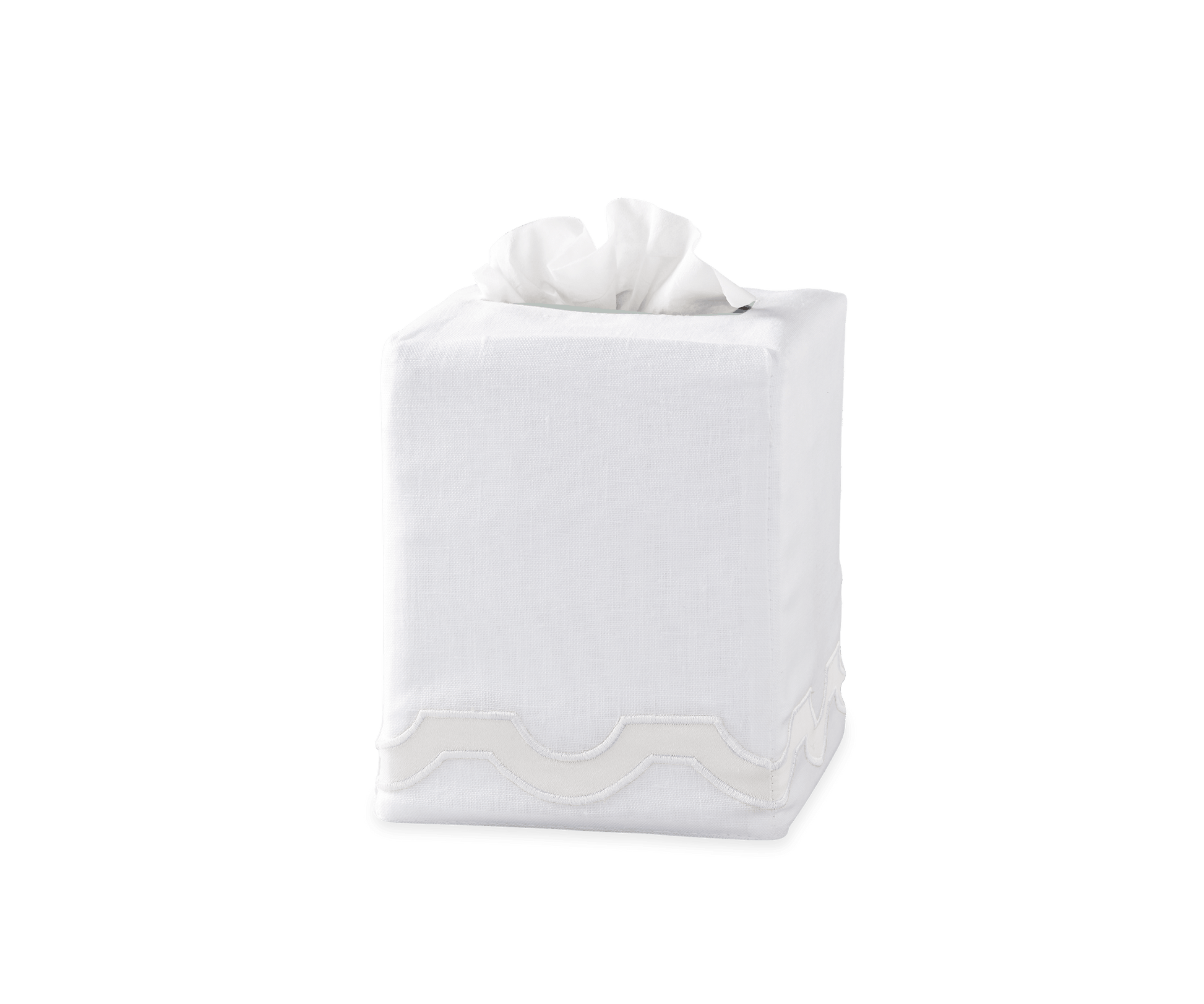 In 100% linen with a sateen appliqué trim, the Mirasol tissue box cover pairs with the top-selling bedding collection of the same name. In a home where no detail goes unconsidered, this playful and sophisticated style makes a beautiful addition to a bedroom or bathroom.Tissue Box Cover: 4.5" W x 4.5" D x 5.5" L. Made in the Philippines of fabric from Italy.