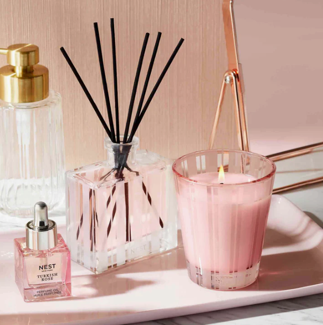 Ease your mind and soothe your spirit with this scented candle featuring notes of rosewater, geranium, salted amber, and white woods.