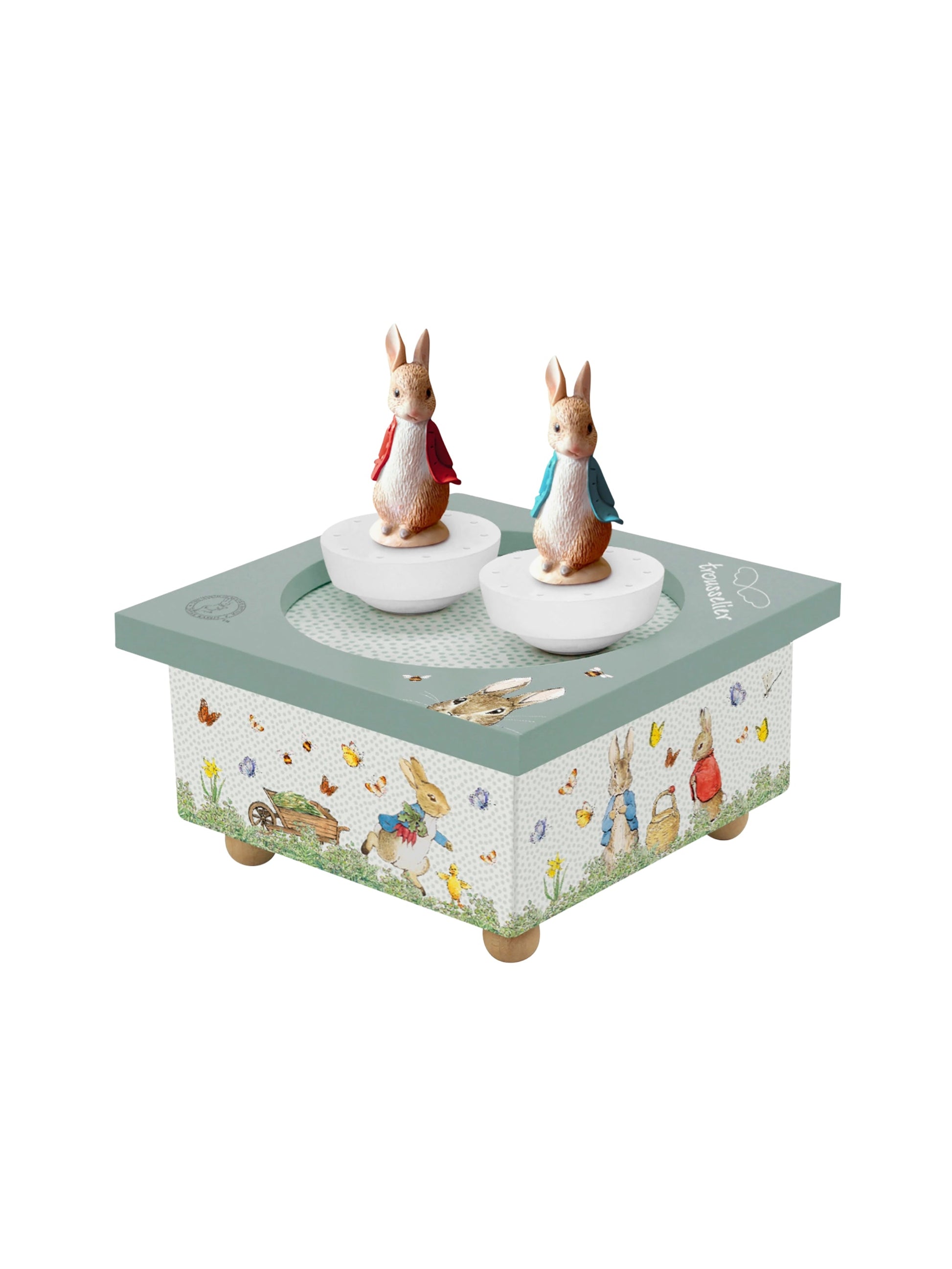 Peter and his friend dance around the top of this whimsical wood footed music box.