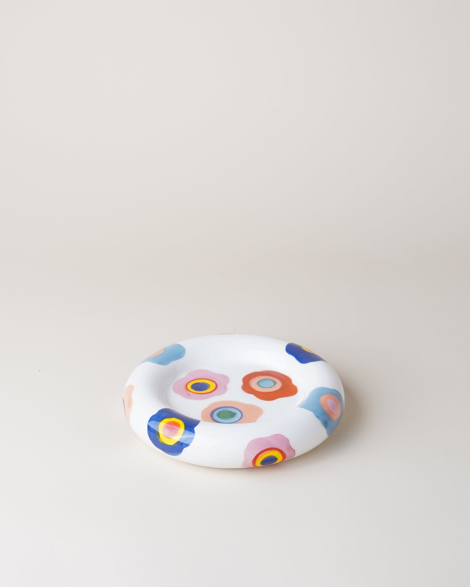 Inspired by the lively Spanish lifestyle and featuring Que Rico's ojos vivos pattern, this bold and chunky plate will add life and sunshine to any tablescape. Its chunky design and warm colours make it a great alternative for holding trinkets or keys, or even as a coaster for your favourite mug!