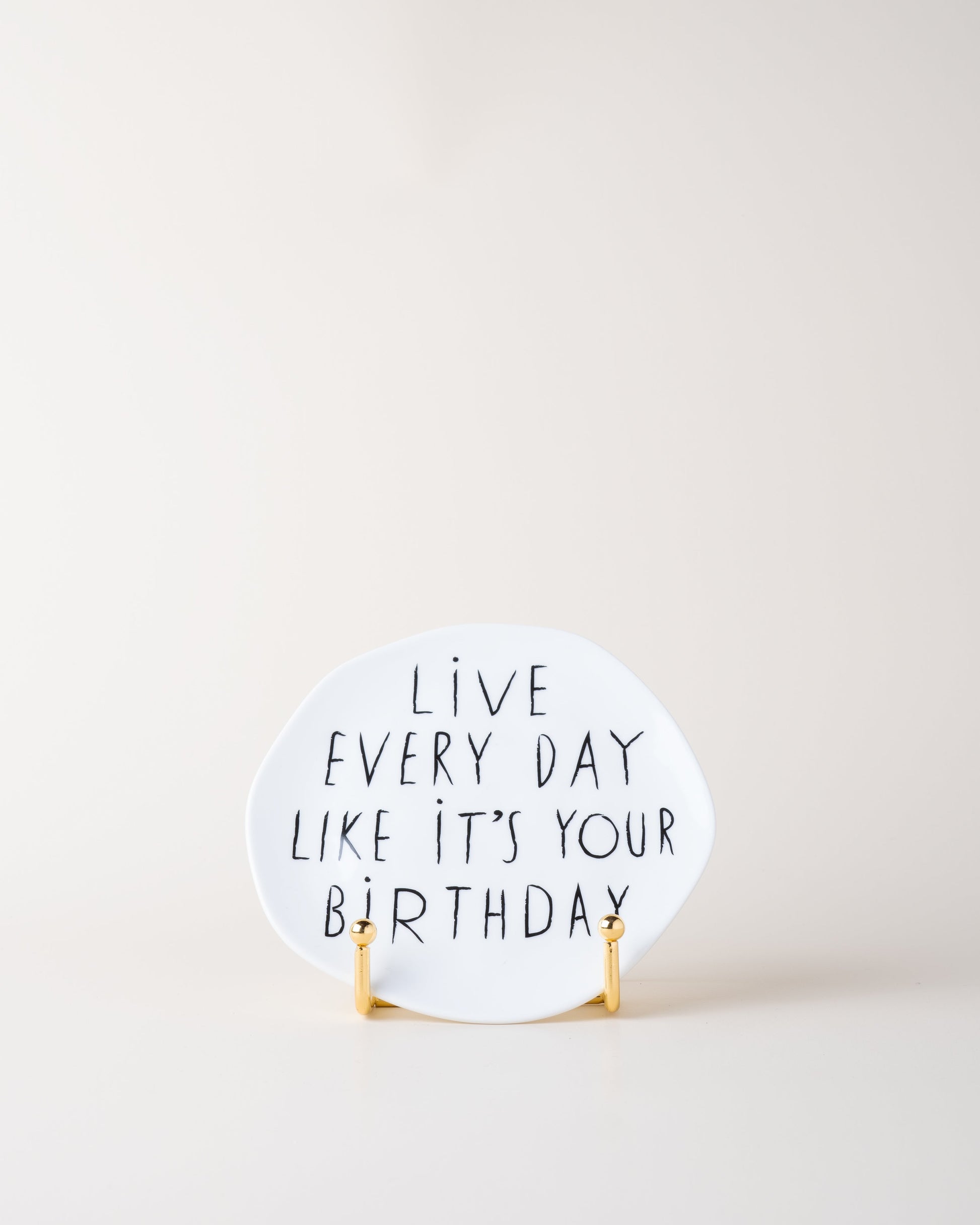 Serve your breakfast and start your day with Räeder's "live every day" plate. The writing is printed on the white porcelain body in gold foil making it a sophisticated design, despite it's simplicity. Sold individually to allow you to mix and match, or gift to someone who perhaps needs the daily reminder.