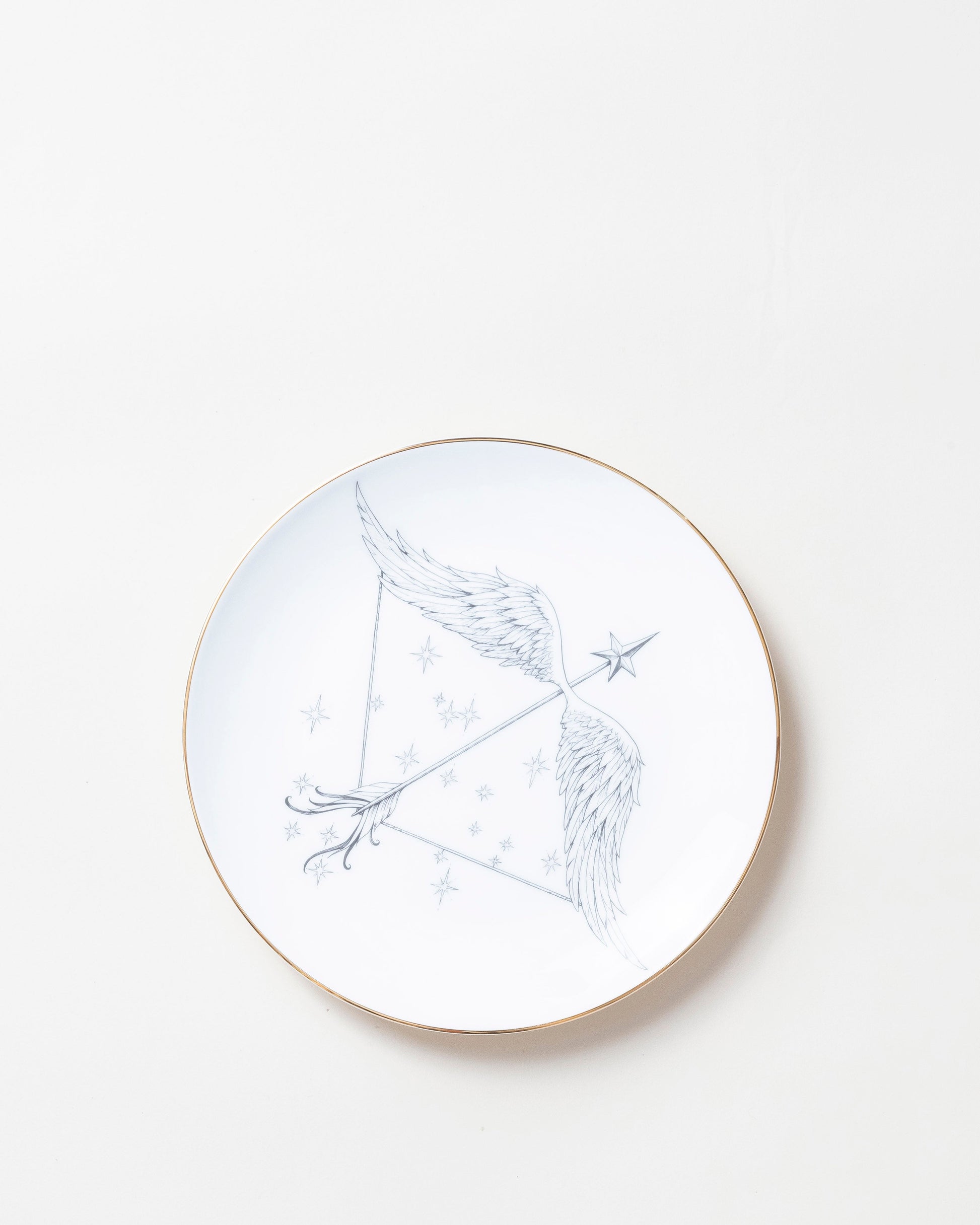 The sagittarius zodiac is celebrated with this fine bone china plate by Rory Dobner. With his signature intricate illustration of a feather bow and arrow and a 22kt gold edged rim, it makes the perfect gift for the sagittarians in your life. Ready for long lunches, delicious dinners, or to hang on the wall as a piece of art in it's own right.