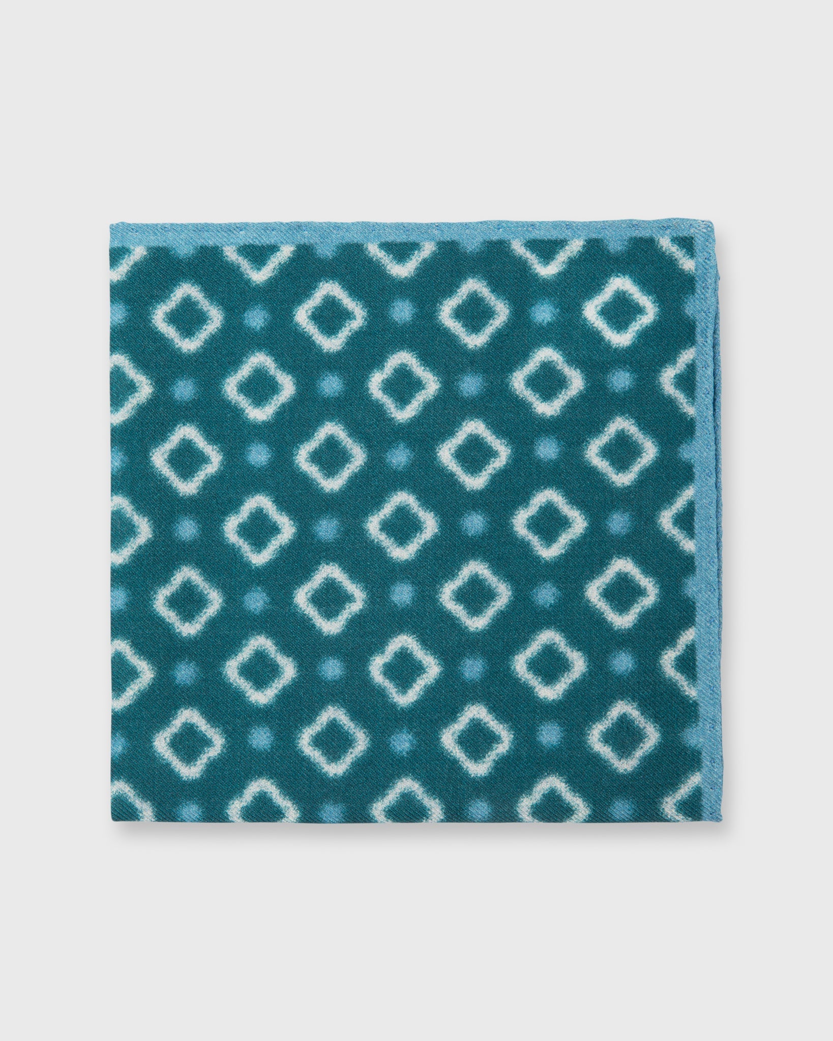 Wool/Silk Print Pocket Square in Forest/Lovat Blue/Bone Diamond