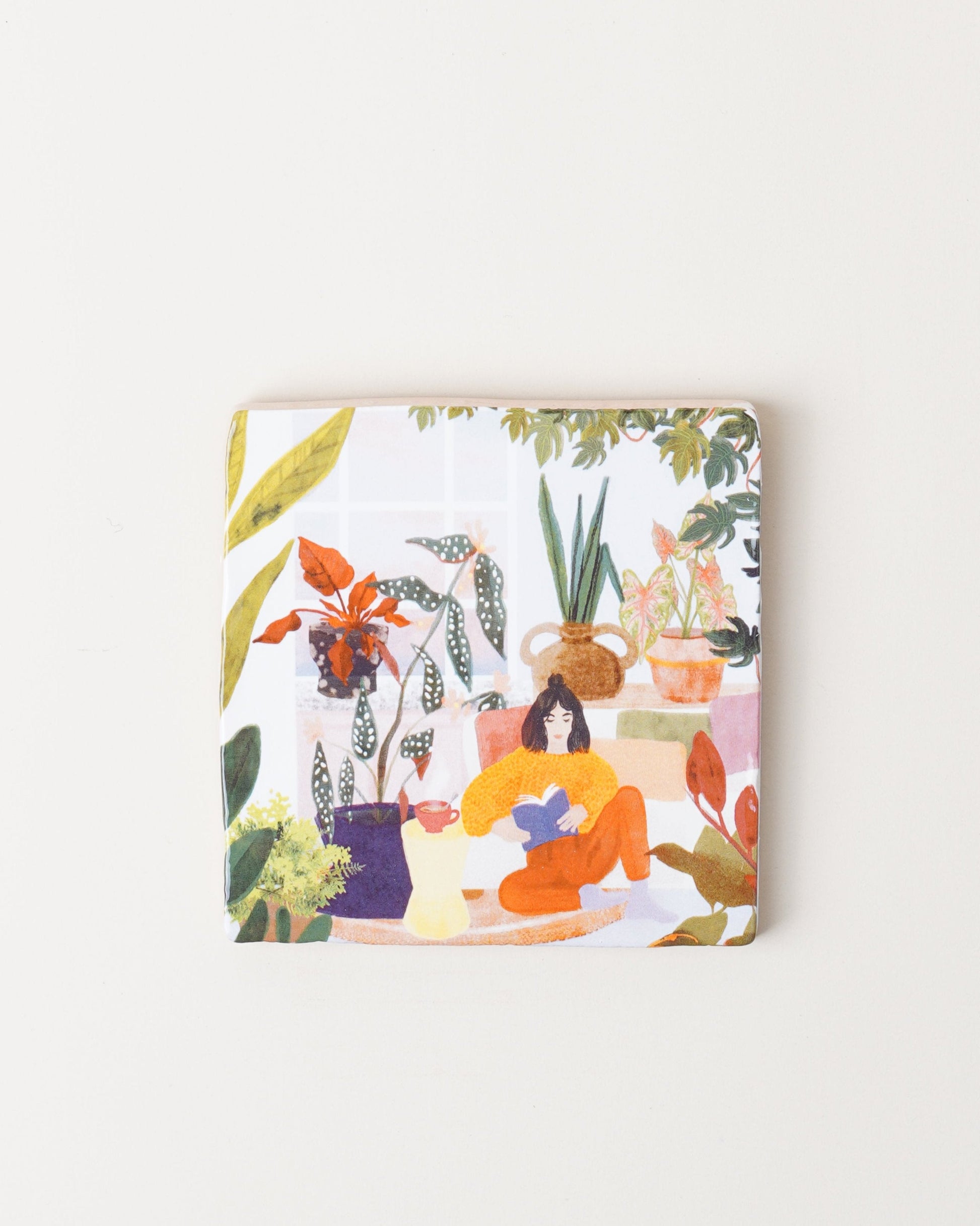 "A tile for the one who enjoys the little things in life with by StoryTiles. Ceramic tiles have been made in and around Delft, The Netherlands, since the 16th century. StoryTiles continues the tradition by creating miniature art-on-tiles. This one captures a young lady sitting amongst her houseplants with a steaming cup of cacao and her favourite book - a Sunday afternoon on a tile?