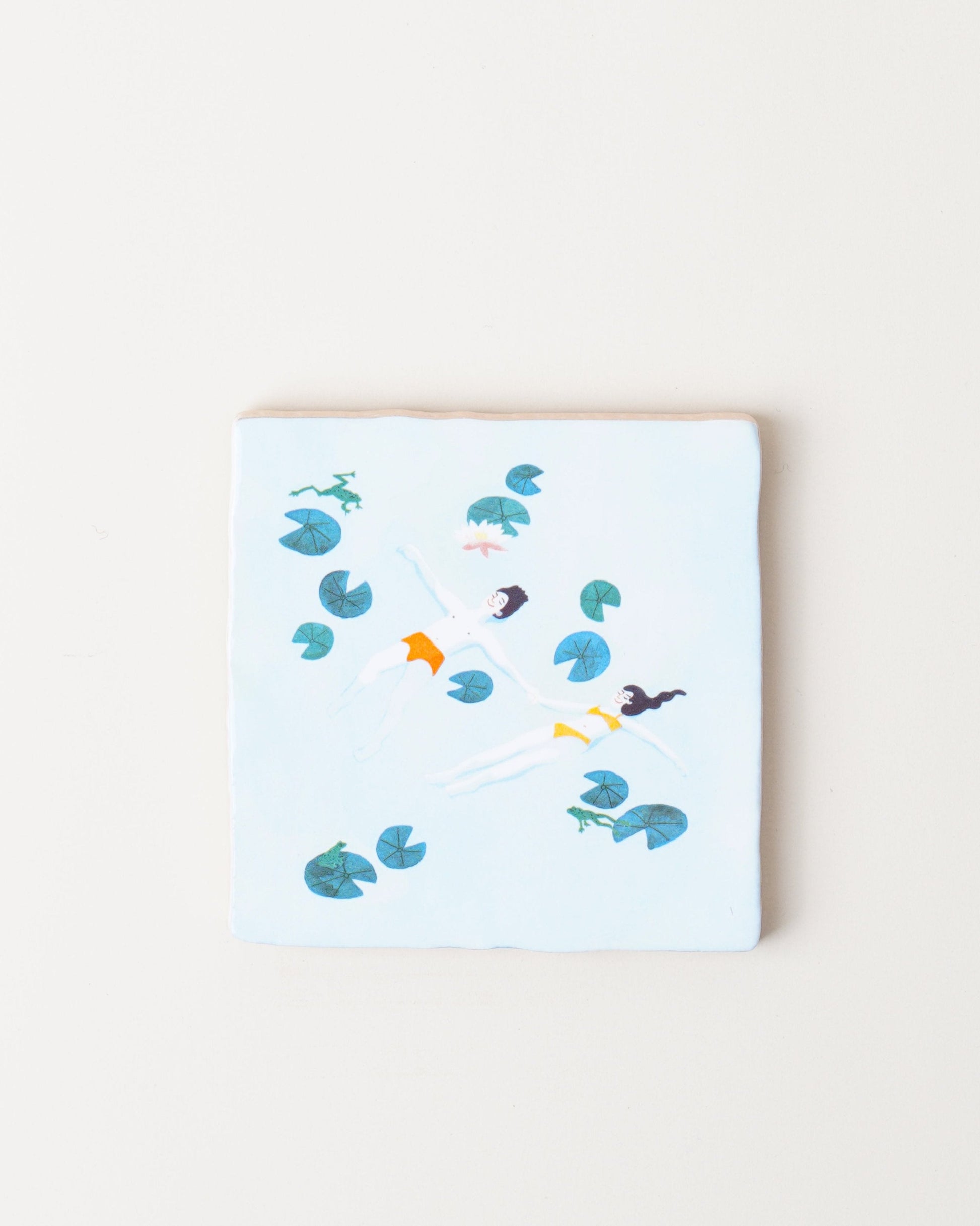 "A tile for the one you love to float through life with by StoryTiles. Ceramic tiles have been made in and around Delft, The Netherlands, since the 16th century. StoryTiles continues the tradition by creating miniature art-on-tiles. This one captures two young friends or loves floating through water with just nature to keep them company.