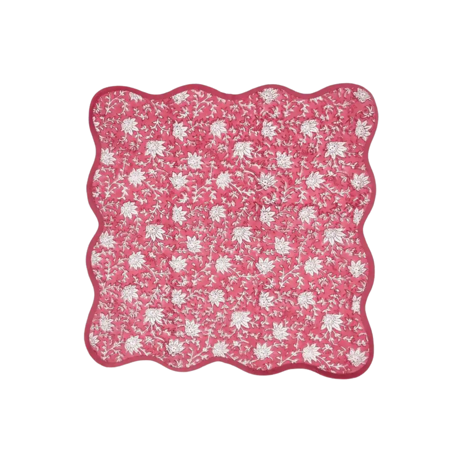 - Our Traditional Pink Floral Block Printed Scalloped Cotton Napkins are great for everyday reusable use, casual dining, or would make a lovely gift! The napkins are pre-washed, have Piping corners, and are ready for use.