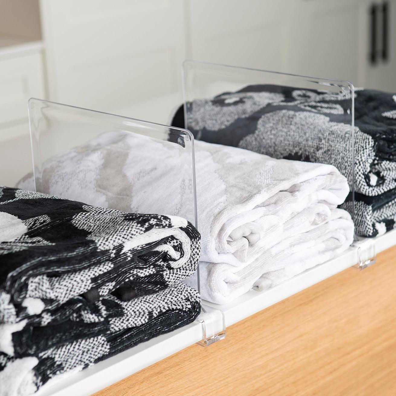 Keep your shelves neat and organised with these adjustable shelf dividers. They are a great solution to keep your clothing, towels, handbags neatly stacked and standing upright without toppling over.